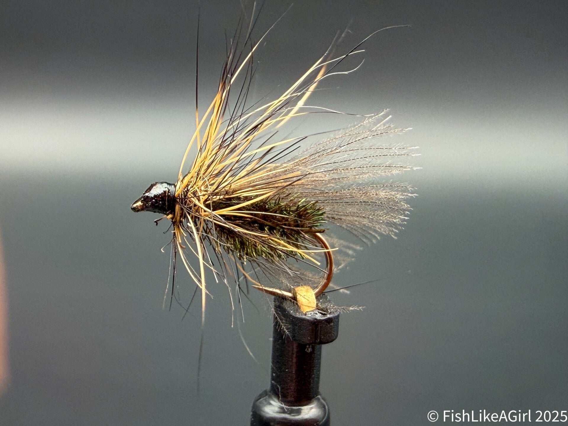 Le corps en herl de paon apporte des reflets naturels subtils, particulièrement attractifs, tandis que l’aile en CDC assure une excellente flottaison et une grande mobilité. Une collerette en lièvre finit la mouche avec légèreté .