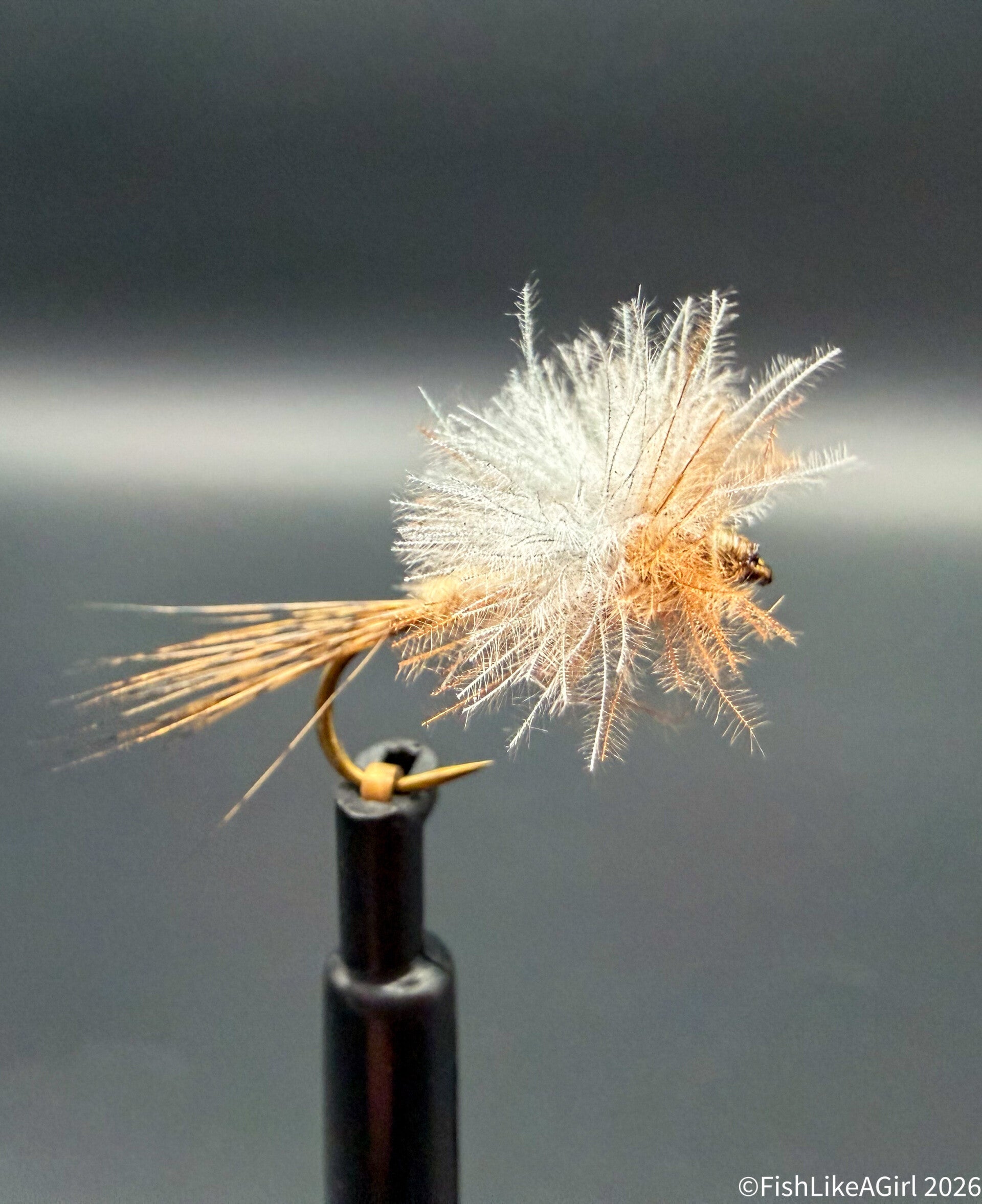 Ce choix de design est à la fois fonctionnel et extrêmement réaliste, puisqu’il imite fidèlement les heptagénidés, insectes dont les cerques jouent le rôle d’un véritable empennage lors de la dérive. Les ailes en CDC Blue Dun, à la teinte sable, sont parfaitement adaptées à l’imitation des subimagos, offrant une silhouette discrète et crédible.