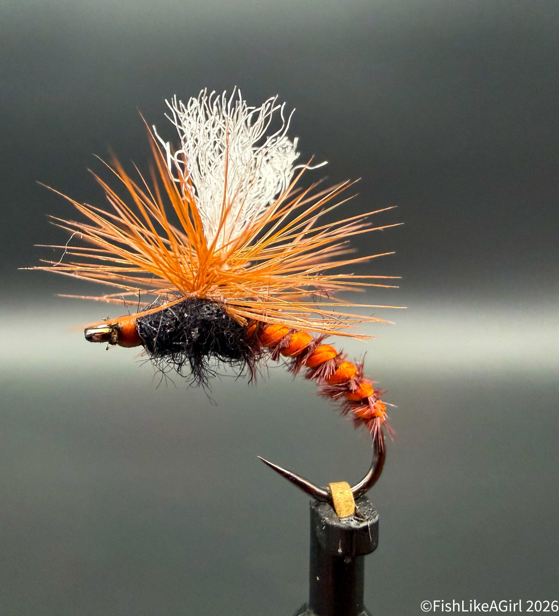 L’abdomen orange segmenté attire l’attention de loin, même dans les eaux rapides ou légèrement teintées. Le thorax sombre et buggy renforce le contraste et suggère une proie bien ancrée dans la surface. L’aile blanche haute visibilité facilite le suivi de la mouche, y compris à distance ou sous faible luminosité.